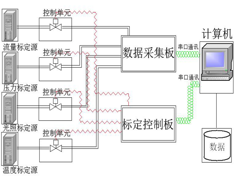 如图1所示,流量标定源经过控制单元一接数据采集板的通道1-4,压力标定源经过控制单元二及数据采集板的通道5-7,光照标定源经过控制单元三接数据采集板通道8,温度标定源经过控制单元四接数据采集板的通道9;控制单元能够按照标定控制板的操作,提供不同量程的标准源,计算机通过串口分别与标定控制板和数据采集板连接。